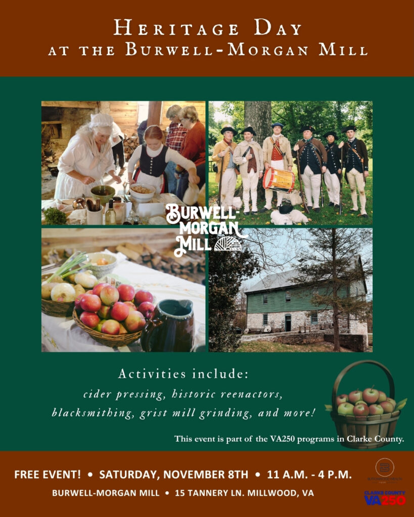 Heritage Day returns for its 14th anniversary. This family friendly event features cider pressing, mill grinding, re-enactors, blacksmithing and more. This year’s festivities will also feature numerous other historic organizations from around the area and will incorporate more historic time periods.