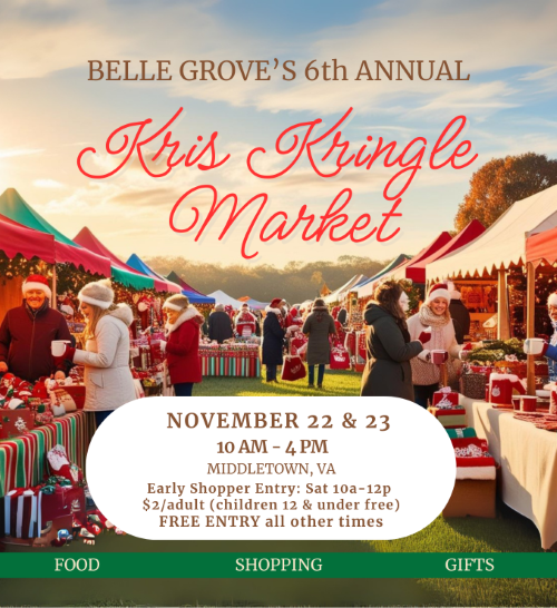 Belle Grove’s Kris Kringle Market is on Saturday, November 22 and Sunday, November 23, 10 a.m.-4 p.m. each day. Early shoppers on Saturday 10 a.m. – noon will have an entry fee of $2/adult (children 12 & younger free) and all other times, admission is free.