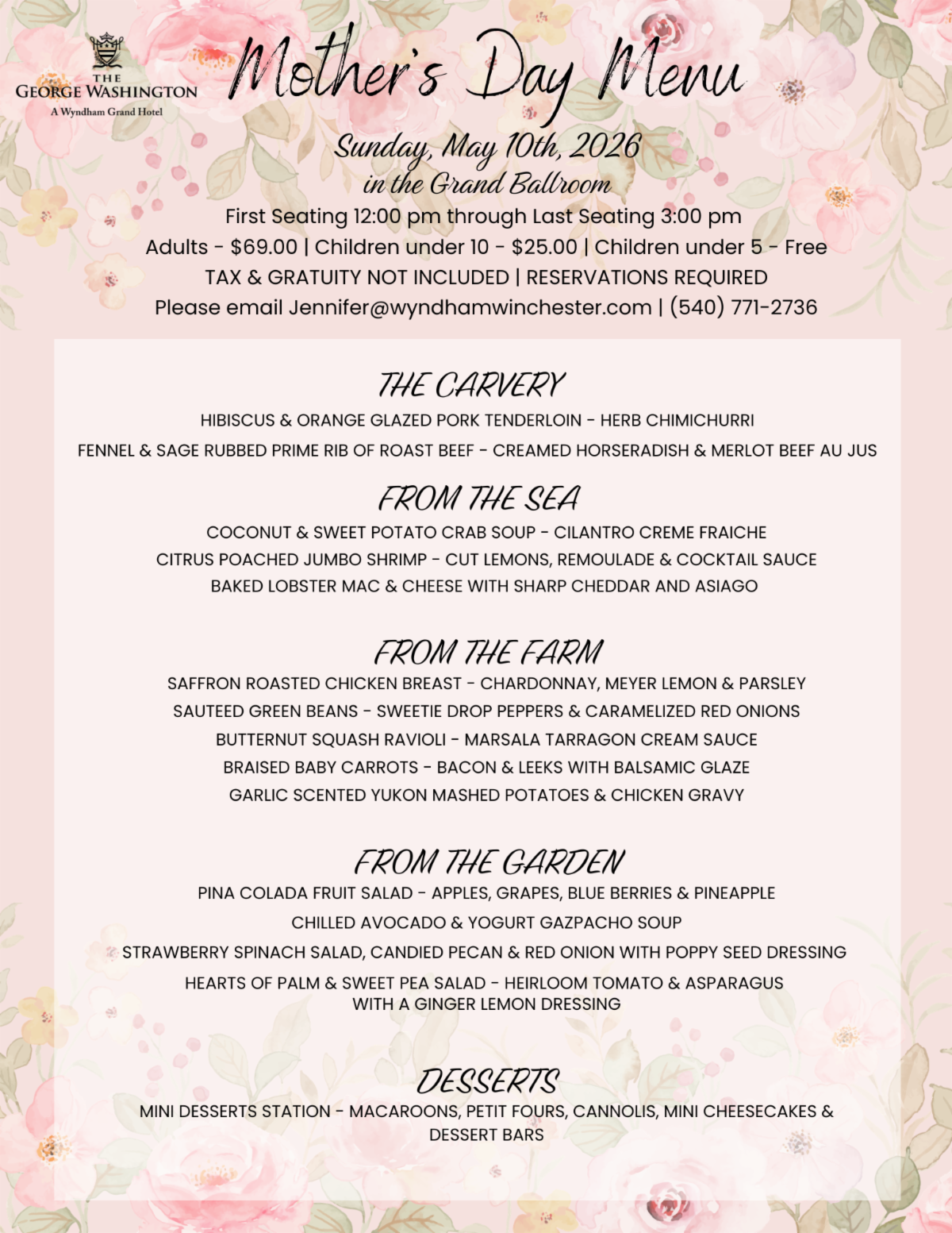 Treat your mother to a beautifully prepared buffet in the Grand Ballroom at The George Washington, A Wyndham Grand Hotel.
