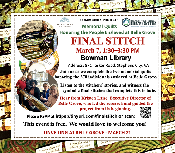 Kristen Laise, Executive Director of Belle Grove, will share how the research began and how the community helped bring this project to life. Guests will be among the first to see the second memorial quilt, hear stories from the stitchers, and witness the symbolic final stitches that complete this tribute.