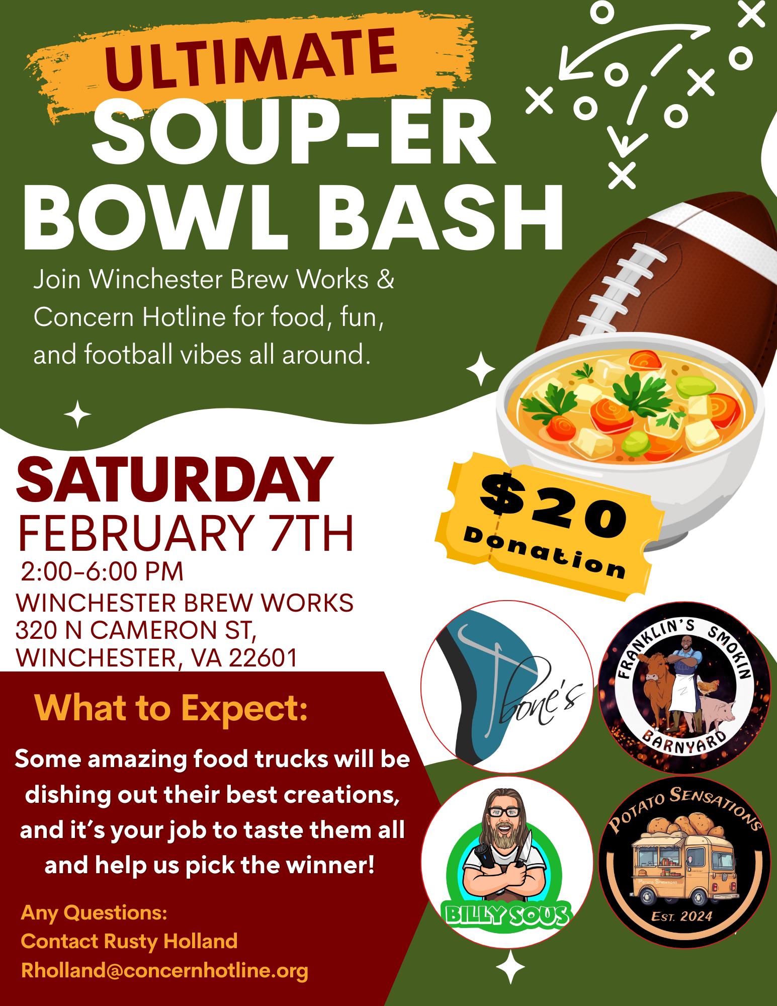 Join Winchester Brew Works & Concern Hotline for food, fun, and football vibes all around. Some of your favorite local food trucks will be dishing out their best soups and other creations, and it’s your job to taste them all and help us pick the winner! Tickets sold online AND at the door.