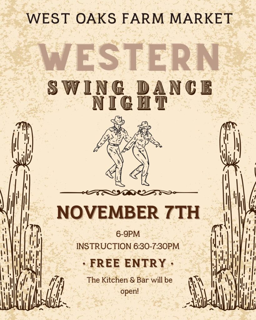Join us at West Oaks Farm Market for a Western Swing Dance Night on Thursday, November 7th from 6–9PM!